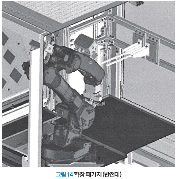 안과 밖 2공정의 연속가공 대응에는 워크 반전대를 확장 패키지로서 선택할 수 있다(그림 14). 기타 품질 체크 스테이션, 에어블로 장치 NG 워크스테이션 등 필요한 기능을 확장 패키지로서 라인업하고 있으며, 유저의 다양한 생산 형태에 대응할 수 있는 자동화 시스템을 제공할 수 있다.
