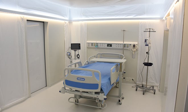 또 텐트에 ‘기능 패널’을 조합해 중환자 치료에 필요한 의료 설비나 기본 병실 집기를 구축할 수 있다. 모듈 조합을 통해서는 음압병동 및 선별진료소, 음압화 중환자 병상, 음압화 일반병실 등 목적에 맞는 의료 시설로 사용할 수 있다.