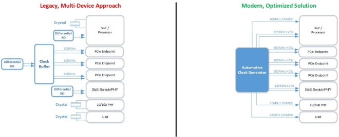 지금까지 자동차 시스템 설계는 낮은 대역폭의 프로세서와 마이크로프로세서를 사용해 왔으며, 이에 따라 각 보드 설계에 한두 개의 단일 종단 레퍼런스 클록 주파수만 필요했다.