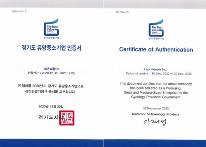 경기도 유망중소기업에 선정된 라온피플은 경기도 유망중소기업 현판 및 인증서는 물론 인증마크 사용권도 받게 된다.