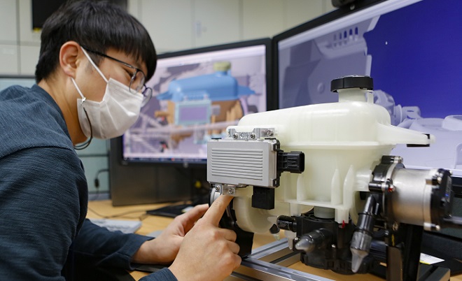 ▲현대위아의 한 연구원이 현대위아 의왕연구소에서 전기차 전용 열관리시스템인 ‘냉각수 분배·공급 통합 모듈’을 살펴보고 있다. <사진 : 현대위아>