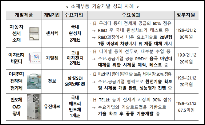 日수출규제 직후 수요기업 참여 기술개발 지원을 받은 25개 품목 중 23개 품목 시제품 개발됐으며 434건의 특허 출원 등 성과도출이 본격화됐다.