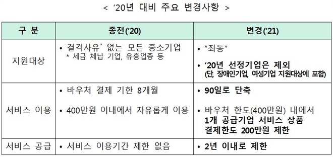 수요기업의 전체 바우처(400만 원) 결제 기한이 기존 8개월에서 90일로 단축되며, 60일 이내 1회 이상 바우처 결제가 없는 기업은 선정을 취소해 실제 이용 수요가 있는 기업에 바우처 사용권이 조기에 부여된다.