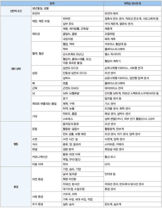 표 1은 문헌 ‘Wearable Sensors for Remote Health Monitoring’ 등을 참고해 라이프 데이터의 항목과 그 계측법, 정보원을 정리한 것이다. 이러한 항목 중에는 센서에 의한 직접적인 계측 대상이 아닌 것도 포함되어 있지만, 건강 상태의 요인이 될 수 있는 항목을 되도록 많이 다루고 있다.