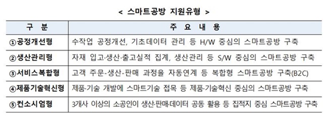 올해부터 3개사 이상의 소공인이 협업해 공동생산, 데이터 활용이 가능한 ’컨소시엄형 스마트공방‘, 신제품 개발에 스마트기술을 접목한 ’제품·기술혁신형 스마트공방‘ 과제를 추가하는 등 지원유형도 다양화했다.