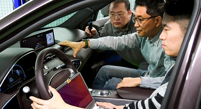현대자동차그룹 연구원들이 ‘커넥티드 카 인공지능 음성인식 기술’을 자동차에서 테스트하는 모습. (출처 : 현대자동차그룹)
