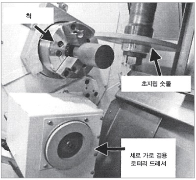 저자 등은 선반형 5축 복합가공기를 이용해 절삭과 연삭의 복합가공에 관한 연구를 해왔다. 예를 들면 절삭가공기로 담금질강이나 경취 재료를 가공하는 경우, 초지립 숫돌의 이용이 반드시 필요하게 된다. 보통 연삭숫돌은 기상에서 수시로 트루잉·드레싱을 하면서 이용된다. 동 연구실에서 소유하고 있는 선반형 5축 복합가공기(야마자키마작제 : INTEGREX 100-Ⅲ)는 그림 1에 나타냈듯이 척 하부에 설치되어 있는 툴 프리세터의 위치를 변경해 세로 가로 겸용 로터리 드레서(오오타제)를 탑재하고 있으며, 숫돌축을 B축으로 선회시킴으로써 다이아몬드 숫돌이나 cBN 숫돌의 고정도 트루잉·드레싱이 가능하다.