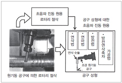 또한, 초음파 로터리 절삭에서 설명한 공구를 초음파 진동시키는 기능은 절삭, 연삭 및 방전가공에서도 효과적이다. 이러한 가공의 조합에 의한 하이브리드화는 초음파+방전 원용 연삭이나 초음파+방전 연삭 축차가공 등 공구 성형뿐만 아니라, 재료가공에도 이용할 수 있다. 1대의 다축 복합가공기를 이용해 여러 가지 응용 전개가 기대된다.