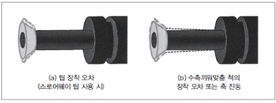 구동형 로터리 절삭에서는 피가공재뿐만 아니라 공구도 회전시켜 가공할 필요가 있으며, 일반적으로 팁 교환식의 절삭공구가 이용된다(그림 4 왼쪽). 그렇기 때문에 공구의 장착 시에 생기는 회전 진동이 과제가 된다(그림 5). 이 회전공구의 회전 진동을 제로로 억제하는 것은 쉽지 않다.