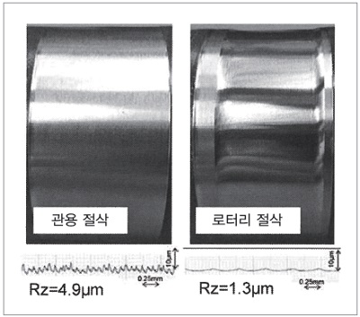 초경 로터리 로드 공구(ø12mm)로 경도 HRC63의 고주파 담금질강 재료의 외주를 로터리 절삭(주속도 : 100m/min, 이송 : 0.1mm/rev.)하면, 코팅 초경 편날 바이트(R0.4mm)로 동일한 조건으로 관용 절삭한 가공면에 비해 그림 6과 같이 양호한 가공면이 됐다. 한편 그림으로 나타내지 않았지만, 초경 로터리 로드 공구의 회전을 멈추고 절삭하면, 현저하게 공구 마모를 일으켰다. 즉, 로터리 절삭은 공구 상의 가공점이 항상 이동, 가공열이 절삭날 전체로 분산됨으로써 초경 날끝부가 산화 온도에 달하지 않아 공구의 소모가 억제된다는 것을 알 수 있었다. 또한, 초경합금 로터리 로드 공구의 직경을 ø6mm로 변경해도 동일한 경향을 얻을 수 있다는 것을 확인했다.