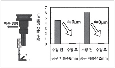 공구의 장착 시에 생긴 공구 회전 진동은 ø6mm 공구에서 4.5μm, ø12mm 공구에서 6μm였는데, 모두 거의 0μm로 수정할 수 있었다(그림 7). 또한, 그림 3의 모식도 중에 나타냈듯이 공구 끝단면의 레이크면도 쉽게 성형할 수 있고, B축 선회에 의해 원하는 레이크 각을 부여할 수 있다. 또한 임의의 칩 브레이커 형상도 성형할 수 있다는 것을 밝혔다.