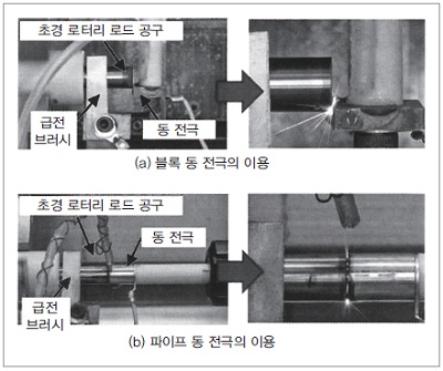그림 8. 블록 동 전극 및 파이프 동 전극에 의한 초경 원기둥 공구의 방전 성형 상황