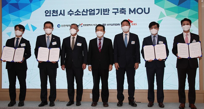 인천시는 이날 서구 원창동 SK인천석유화학 행복드림관에서 현대자동차, SK E&S, 서구청과 함께 '수소산업 기반 구축을 위한 상호협력에 관한 업무협약'을 체결했다.