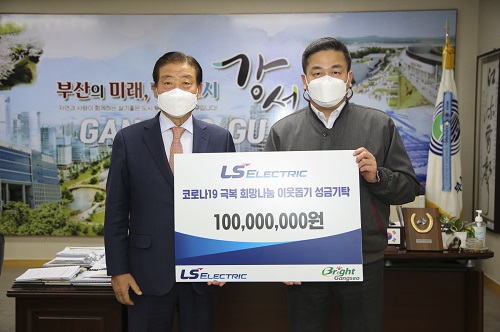 노기태 부산시 강서구청장은 “지역 소외계층 복지 사업에 관심을 가져 준 LS일렉트릭에 감사 드린다”며 “성금은 코로나19로 더욱 어려움이 큰 취약계층 지원을 위해 소중히 사용하겠다” 라고 말했다.