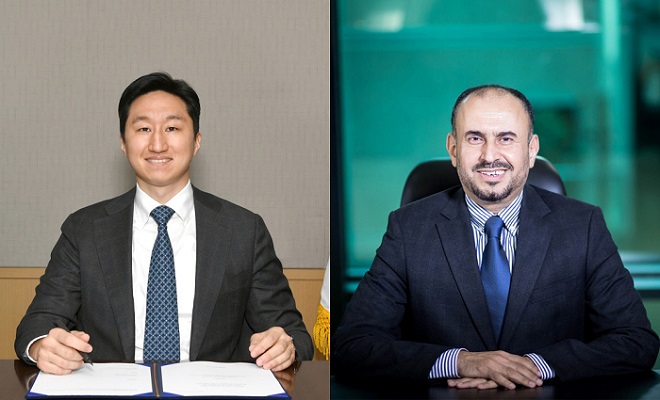 ▲(왼쪽부터) 현대중공업지주 경영지원실장 정기선 부사장과 사우디 아람코의 테크니컬 서비스 부문 아흐마드 알 사디(Ahmad A. Al-Sa’adi) 수석부사장 <출처 : 현대중공업그룹>