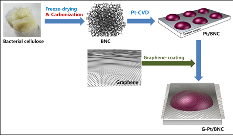 개발된 탄화체 표면에 백금 나노입자를 담지하고, 백금 입자 표면에 다공성 그래핀 보호막을 적용한 새로운 나노샌드위치 구조를 통해 기존의 상용 촉매에 비해 장기 안정성이 220% 이상 향상된 연료전지용 촉매 합성에 성공했다.