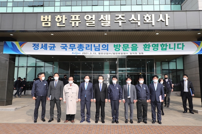 정세균 국무총리가 15일 경남 창원시에 소재한 수소 강소기업인 범한산업·범한퓨얼셀을 방문했다.