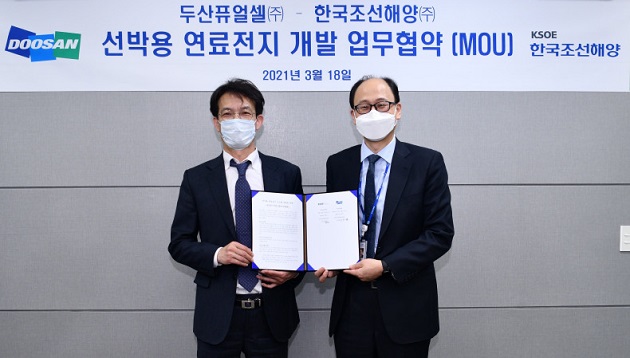 두산퓨얼셀이 현대중공업그룹의 조선 지주사인 한국조선해양과 업무협약(MOU)을 체결하고, 친환경 ‘선박용 연료전지’를 공동개발한다.