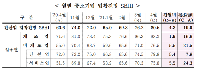 자료에 따르면, 중소기업 4월 업황전망 SBHI가 80.5를 기록하며 전월대비 4.3p 상승해, 3개월 연속으로 반등세를 기록한 것으로 나타났다. 전년동월대비로는 19.9p 상승한 수치다.