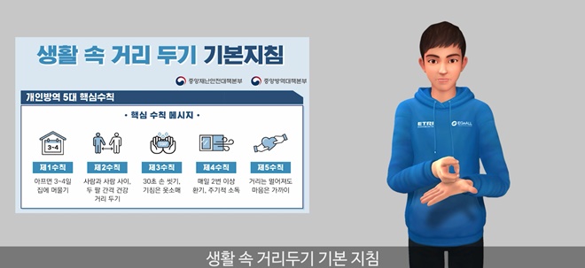 ▲ETRI가 개발한 아바타 수어로 생활 속 거리두기 지침을 표현하는 모습(출처 : ETRI)