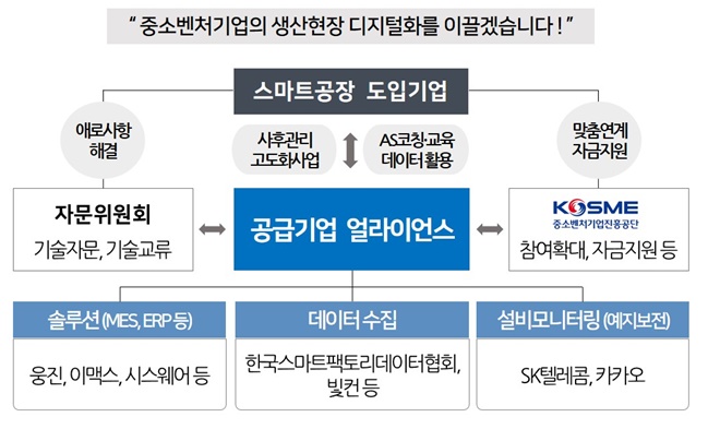스마트공장 공급기업 얼라이언스는 ▲솔루션(MES, ERP 등) ▲데이터 수집 ▲설비모니터링 등의 분야로 구성한다. 또 공급기업을 중심으로 협력사, 대기업, 유관협회 등과의 상호교류 및 협력 기반도 확대해 스마트공장 활성화를 위한 상생모델 구축에 나선다.
