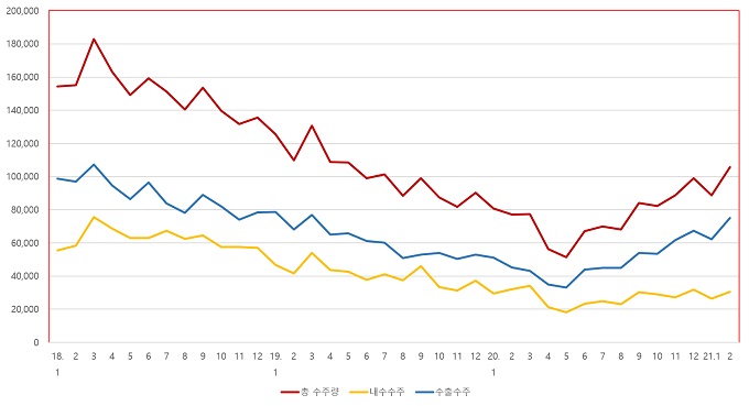 이후 회복세를 보인 6월 대 중국 수주량은 154.5억 엔으로 상승했다. 이러한 영향으로 수출수주는 전반적으로 상승세를 타기 시작했고, 2021년 2월에는 302.1억 엔까지 올랐다.