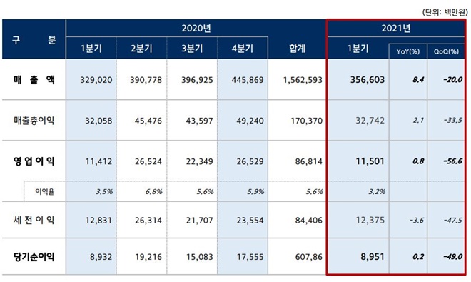 2020년 같은 기간과 비교해 매출은 8.4% 증가했고, 영업이익은 0.8% 증가했다.