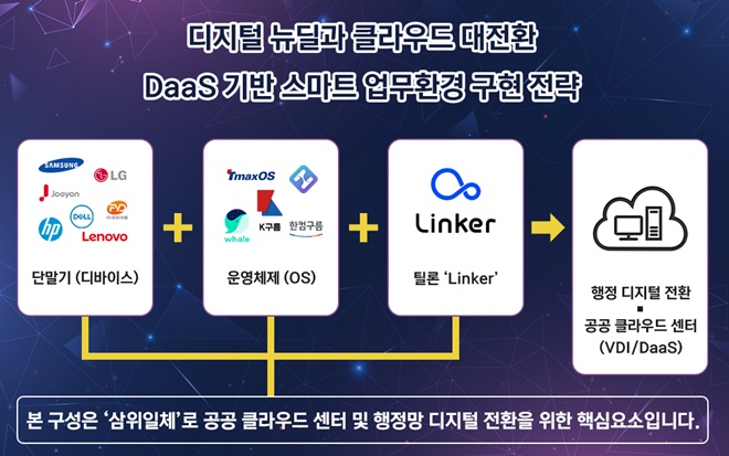 정부가 추진하는 스마트 업무환경 전환 전략은 DaaS(Desktop as a Service) 플랫폼을 기반으로 하고 있다. 단말기, 운영체제, 틸론 ‘링커’ - 삼위일체 구성은 공공 클라우드 센터 및 행정망 디지털 전환을 위한 핵심요소로 자리 잡았다고 틸론은 전했다.