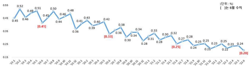 이는 지난 3월 말(0.22%) 이후 역대로 가장 낮은 수치다. 1년 전인 지난해 6월과 비교하면 0.05%포인트 하락했다.