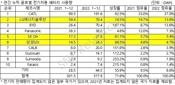 반면 중국 배터리 업체들은 대부분 세 자릿수 성장률을 달성하며 약진했다. 1위 CATL은 배터리 사용량이 99GWh에서 191.6GWh로 2배 가까이 늘며 점유율도 33.0%에서 37.0%로 뛰었다.