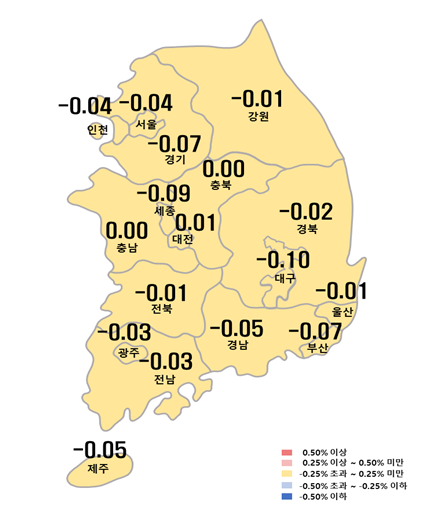 한국부동산원은 수도권, 서울, 지방, 5대광역시,세종, 8개도의 전국 주간 아파트 매매가격 동향을 변동률 –0.02%(8개도)~-0.09%(세종)의 구간에서 하락폭이 지속 되었다고 밝혔다.