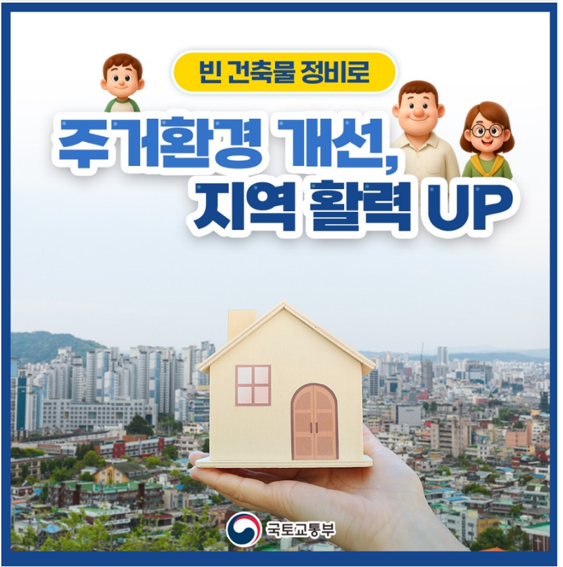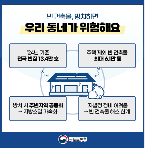 국토교통부(장관 김윤덕)는 지난 10월 2일(목) 오전 정부서울청사에서 개최된 제2차 경제관계장관회의에서 주거 환경 개선과 지역 활력 제고를 위한 「빈 건축물 정비 활성화 방안」을 발표하였다. 이는 증가하는 빈 건축물로 인해 발생하는 지역 쇠퇴와 지방 소멸 가속화 우려에 선제적으로 대응하기 위함이라고 설명하였다. 이에 대한 (10월2일자 기사의 pdf 자료 추가 설명 기사 ) 상세 내용은 다음과 같다.