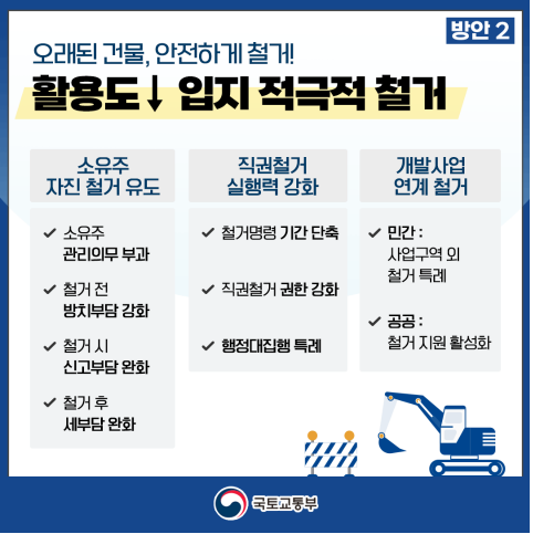 지자체 직권 철거 실행력 강화: 붕괴·재해 등 안전사고 발생이 우려될 때는 지자체의 철거 명령을 의무화하고, 소유주가 철거 의무를 미이행할 시 지자체가 직권 철거 후 그 비용에 대해 소유주에게 구상권을 청구할 수 있도록 법적 근거를 마련한다.