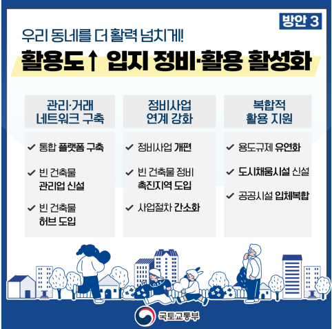 3. 활용도 높은 입지의 정비·활용 활성화활용도가 높은 빈 건축물의 유휴 자산 활용 가치를 높이기 위한 관리·거래 네트워크를 구축한다.