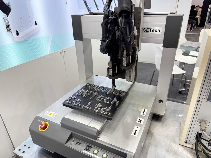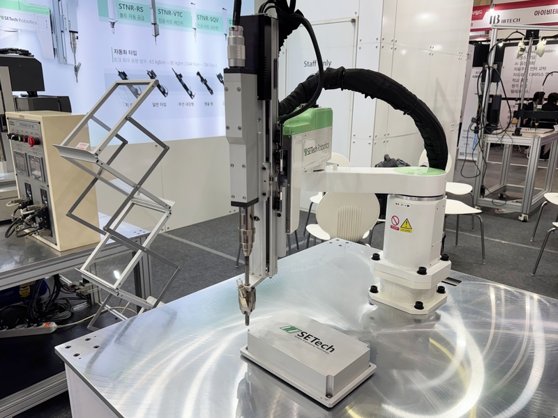 쎄텍은 5일 일산 킨텍스에서 열린 2025 로보월드에서 부스를 꾸리고 전시회를 찾은 관람객들에게 너트와 볼트 체결을 위한 전동식 자동화 장비 스카라 너트런너 로봇 SR3 시리즈를 소개했다.