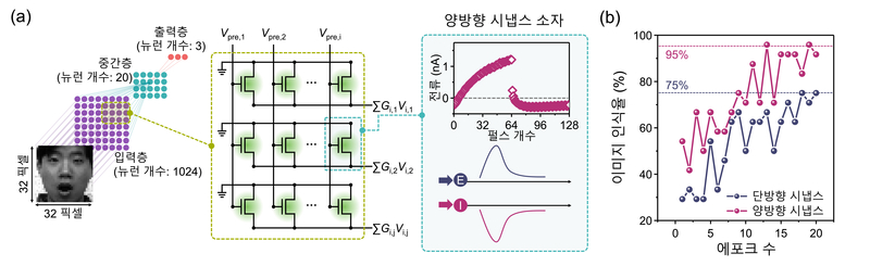 이번 연구는 단일 소자만으로 양방향 인공 시냅스를 구현한 첫 사례로, 기존 하드웨어 신경망의 구조적 한계를 근본적으로 극복한 것으로 평가된다. 이 기술은 고집적·저전력 인공지능(AI) 반도체(뉴로모픽 칩) 구현을 앞당길 핵심 기술로, 향후 이미지 인식·패턴 분석 등 온칩 학습(On-chip learning) 기반의 실시간 AI 처리 시스템에 폭넓게 활용될 것으로 기대된다.