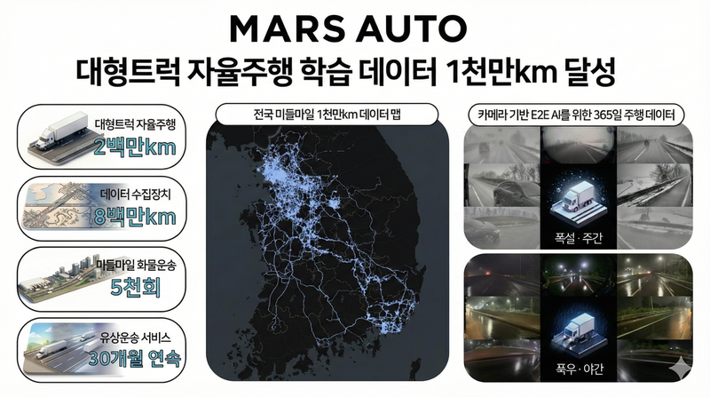 박일수 마스오토 대표는 “1000만km 데이터 확보는 미들마일 자율주행 상용화를 향한 중요한 전환점”이라며 “파트너사 대상 마스박스를 1000대 이상으로 확대해 1억km 규모 데이터 확보에 나서는 동시에 E2E 자율주행 기술 고도화를 지속하겠다”고 밝혔다.