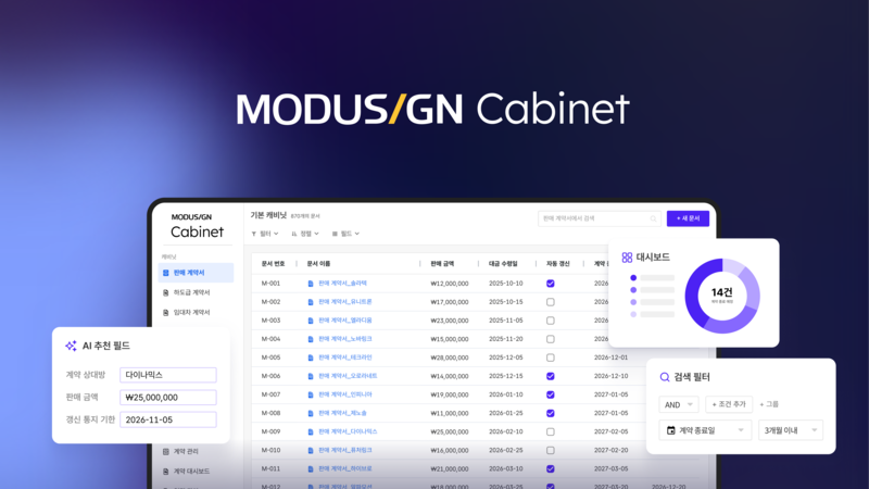 이용자 경험 개선도 강화됐다. 캐비닛에는 OCR, 대규모언어모델(LLM), 도메인 지식베이스가 결합된 AI 엔진이 탑재돼 계약서 유형 분류와 메타데이터 추출 정확도가 높아졌다. 향후 모두싸인이 제공하는 eSign, Form, Review, Cabinet 전 제품군이 단일 AI 인텔리전스 레이어에서 연결되도록 설계되어 계약 데이터가 제품 간 단절 없이 흐르도록 지원한다. 이는 기업의 계약 데이터가 ‘운영 자산’으로 전환되는 기반이 될 전망이다.