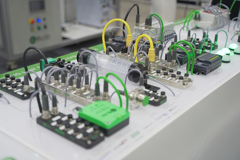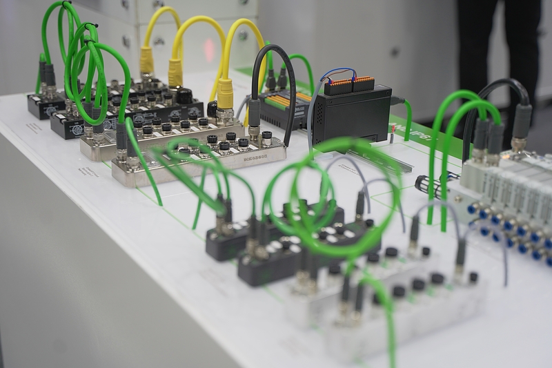 현장에서는 초록색 케이블들이 여러 블록형 모듈에 연결돼 센서·구동부(Actuator)를 통합하는 모습이 연출됐다. 각각의 모듈 위 LED가 실시간으로 입출력 상태를 표시해 사용자에게 상황을 직관적으로 알린다. 이는 생산 설비, 로봇 등에서 센서·스위치를 일일이 제어반까지 배선하던 방식에서 벗어난 접근법이다. 라인 근처에 분산 I/O를 두고 짧은 드롭 케이블로 연결하는 최근 트렌드를 반영한 모습이다.