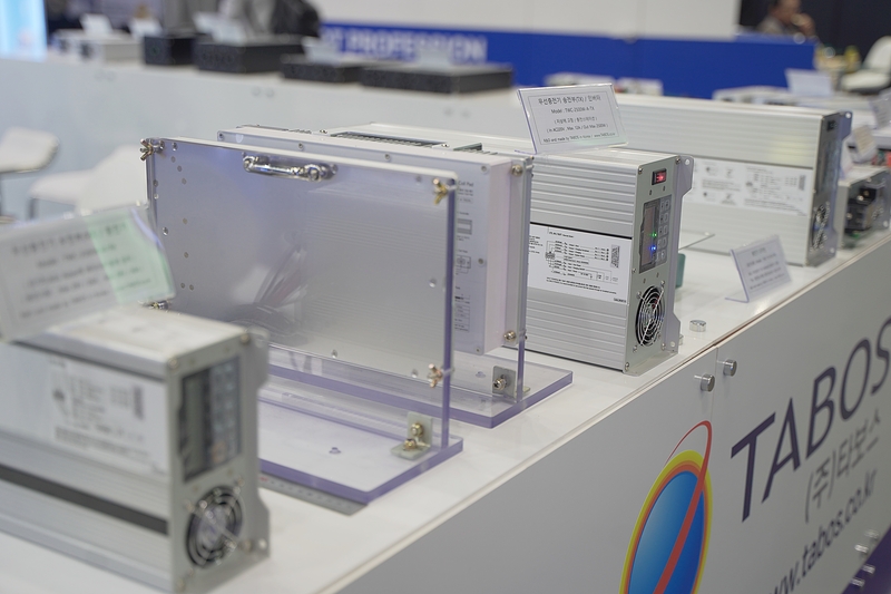 리튬 이온(Lithium Ion) 배터리 및 충전 시스템 업체 타보스는 로봇과 무인 운반 장비의 전원 계통을 맡는 솔루션을 소개했다. 전면에는 AMR·모터용 리튬 이온 배터리 팩과 전용 충전기가 배치됐다.