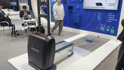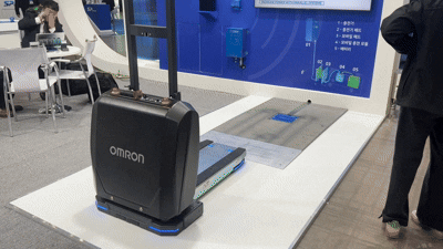 ▲ 펄스 그룹의 한국 지사 펄스파워코리아가 자사 비즈니스 유닛인 와이페리온(Wiferion)의 무선 충전 기술을 들고 나왔다. 일본 소재 산업·공장 자동화(FA) 업체 오므론(OMRON)의 AMR을 통해 자사 충전 솔루션을 시연했다. (촬영·편집 : 헬로티 최재규 기자)