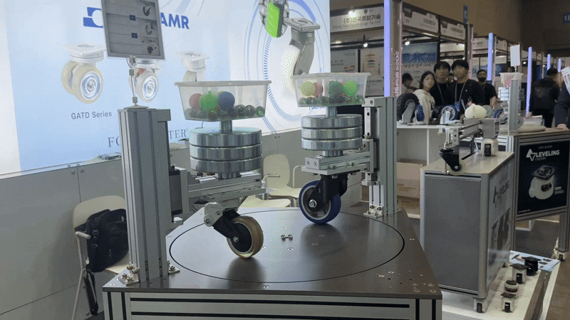 이번 전시에서는 무인운반차(AGV)·AMR 전용 휠과 이차전지 라인용 캐스터 등 제품도 눈에 띄었다. 해당 제품군은 충격을 줄이는 댐핑(Damping) 설계와 저소음 휠 소재를 적용했다. 여기에 라인 사이를 오가는 휠 기반 로봇이 바닥 요철을 넘어갈 때 발생하는 진동을 줄이는 데 초점을 맞췄다. 일부 제품은 브레이크와 락킹 메커니즘을 내장해 로봇이 정지했을 때 바퀴가 미끄러지지 않도록 설계했다.