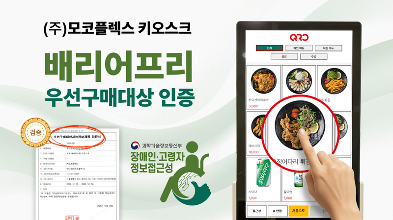프랜차이즈 통합 관리 솔루션 ‘큐로(QRO) 비즈’를 운영하는 모코플렉스가 ‘큐로 배리어프리 키오스크’로 정부 공식 인증을 획득하며 디지털 접근성 분야에서 기술 경쟁력을 입증했다. 모코플렉스는 한국지능정보사회진흥원(NIA)이 발급하는 우선구매대상 지능정보 제품 검증서를 취득, 장애인과 고령자 등 디지털 취약계층을 고려한 키오스크 접근성과 사용성을 공식적으로 인정받았다.