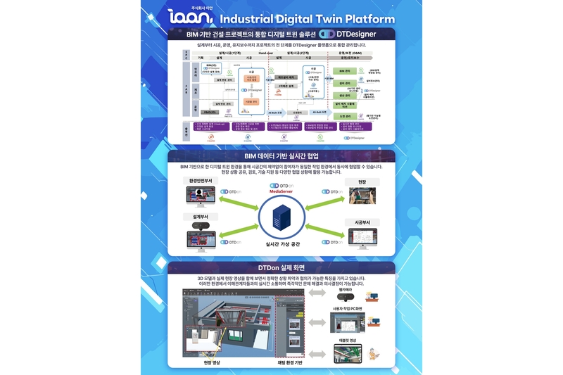 먼저 스마트 시티와 사물인터넷(IoT) 기술이 집결하는 ’노스홀(North Hall)‘에서는 이안의 핵심 플랫폼 ‘DT디자이너(DTDesigner)’ 제품군을 소개한다. 이 솔루션은 반도체 공장, 데이터센터 등 복잡한 시설의 설계·시공 데이터를 통합 관리하도록 돕는 기술이다. 사측에 따르면, 프로젝트의 완성도를 높이고 시공 후 유지보수 단계에서의 데이터 활용성을 극대화하는 기술력이 집약돼 있다.