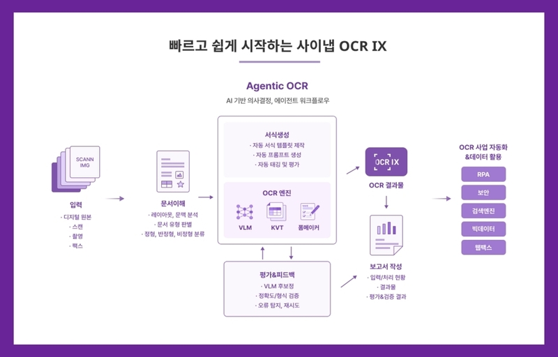 도큐먼트 AI 전문기업 사이냅소프트는 시각 언어 모델과 AI 에이전트 기술을 결합한 ‘사이냅 OCR IX’를 출시하고, 기존 정형 서식 중심 OCR을 넘어 비정형 비즈니스 문서 영역까지 대응하는 ‘Agentic OCR’ 시대를 연다고 밝혔다. 회사는 이번 신제품을 통해 고도의 문맥 이해가 요구되는 문서 처리 환경에서 인공지능 전환을 주도한다는 전략이다.
