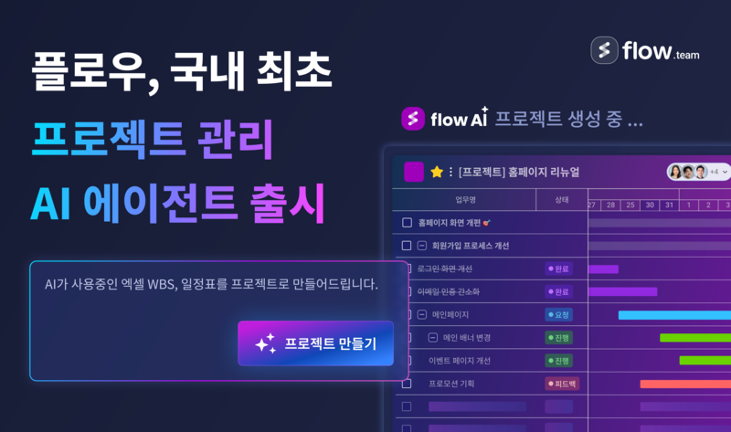 이번 업데이트를 통해 플로우는 단순 업무 관리 도구를 넘어 기획 단계부터 개입하는 ‘AI 협업 플랫폼’으로의 전환을 본격화했다. 사용자가 프로젝트 목적을 입력하거나 기존 엑셀 WBS, 기획 문서를 업로드하면 AI가 프로젝트 맥락을 분석해 전체 구조, 상세 업무 리스트, 일정 흐름까지 자동으로 설계한다. 프로젝트를 어떻게 시작할지 고민하는 단계 자체를 AI가 대신하는 구조다.