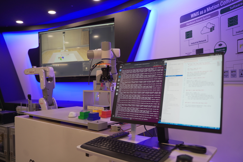현장에서는 'WMX', 엔비디아의 로보틱스 시뮬레이션 플랫폼 ‘엔비디아 아이작 심(NVIDIA Isaac Sim)’, 차세대 로봇운영체제(ROS) ‘ROS2’, 오픈소스 경로 생성 프레임워크 ‘MoveIt2’ 등을 한데 통합한 데모를 만날 수 있었다. 이 과정에서 로봇 상태와 계산된 경로를 화면으로 확인하는 시각화 도구도 함께 구동됐다. 데모에서 WMX는 하드웨어 ‘제어 박스’ 역할에서 더 나아간 형태였다. 데이터가 실제 움직임으로 변환되는 핵심 실행 단계인 것.