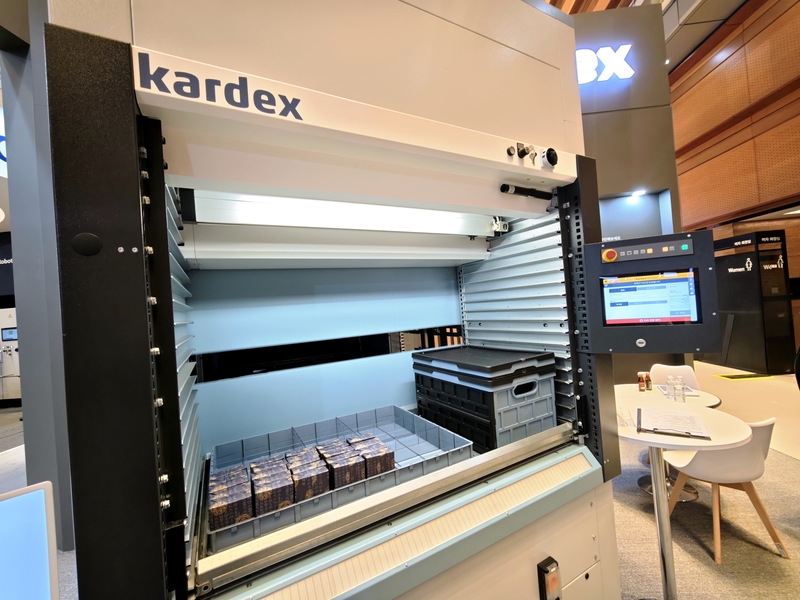 이번 전시회에서 카덱스는 수직 보관 시스템 라인업을 공개했다. 카덱스 셔틀(Kardex Shuttle)은 수직 리프트 모듈(VLM) 제품군으로, 기계의 전면과 후면에 트레이를 2열로 수직 보관한다. VLM 가운데 위치한 추출기(extractor)가 트레이를 입출고 게이트로 자동 이동시킨다. 옵티플렉스(Optiflex) 기술은 각 트레이에 보관된 상품의 높이를 측정해 최적의 보관 위치에 배치하며, 툴 보관, 오더 피킹, 반제품 및 예비 부품 관리에 효율적이다.