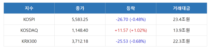 KOSPI는 전일 호르무즈 리스크 확대 등에 따른 국제유가 반등 등 영향으로 하락 출발하였으며, 옵션 만기일 영향 등 맞물리며 변동성이 확대되었으나, 저가 매수세가 유입되며 낙폭 축소 마감했다. 3일 만에 하락이다. 대형주(-0.6%)가 약세를 보인 반면 중형주(+0.6%), 소형주(+1.2%)는 강세를 보였다. 업종별로는 보험(-2.9%), 제약(-1.3%), 전기·전자(-1.2%), 금융(-1.0%) 등이 하락을 주도했다. 투자자별로는 기관(+576억원)과 개인(+2조2,290억원)이 순매수한 반면 외국인(-2조3,711억원)은 대규모 순매도했다.