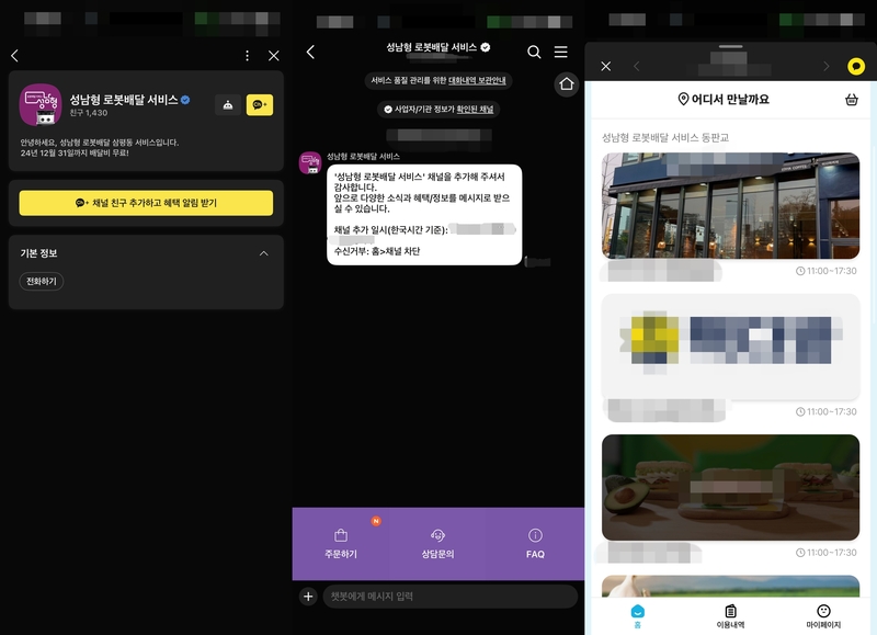 이날 기자는 실제 서비스를 직접 이용해봤다. 사측이 내세우는 직관적 이용 방식을 경험했다. 우선 모바일 메신저 카카오톡 채널 ‘성남형 로봇배달 서비스’를 친구 추가하는 것이 첫 번째 관문이다. 이후 주문하기, 점포 선택, 품목 선택, 배송지 선택, 카드 결제 순으로 주문 등이 그 다음 순서다.
